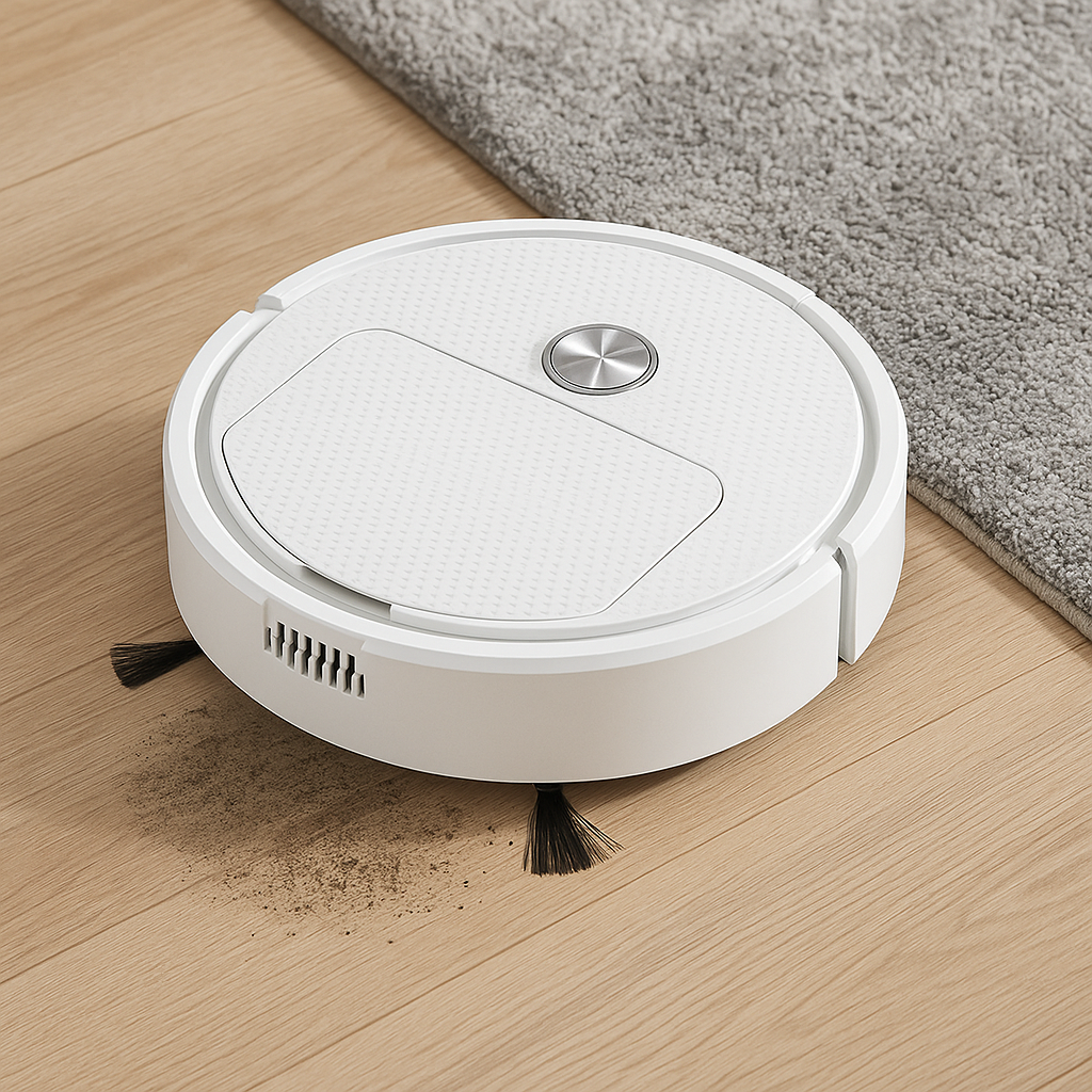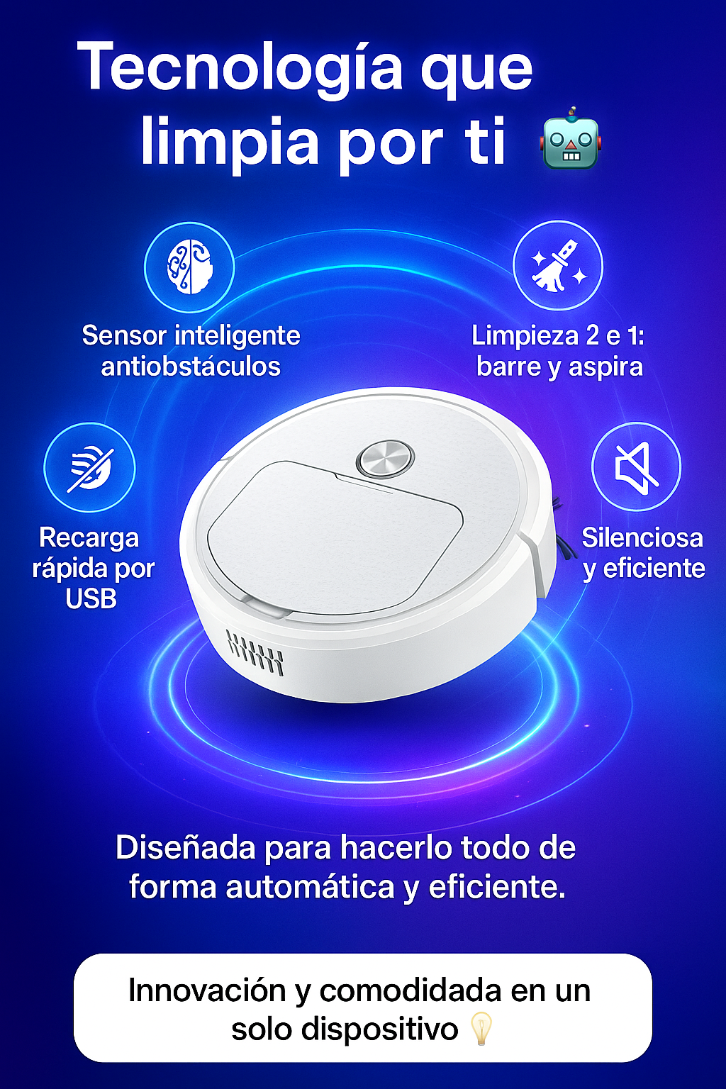La Aspiradora Robot 2 en 1 combina cepillos giratorios y succión simultánea para eliminar polvo y pelos. Basta con encenderla y dejarla recorrer el piso; sus sensores evitan choques y limpian todos los rincones.
